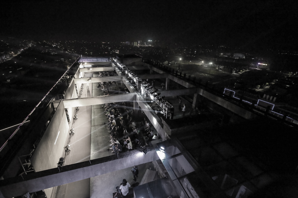 位于大厦顶楼的发布会空间,LED屏和绚丽灯光具体神秘时尚的巡展氛围,原始自然的植被建筑及YuanYang15秋冬季成衣,更体